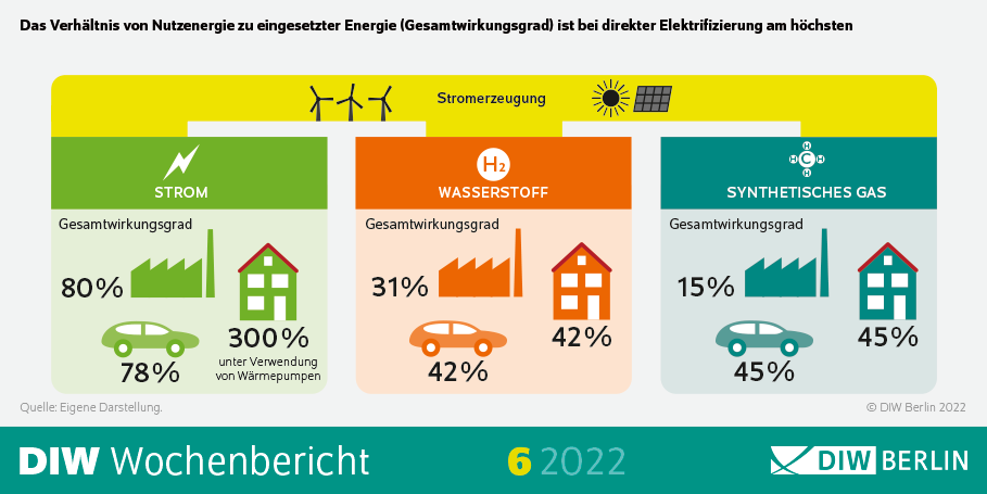 Elektrifizierung kostengünstigster und effizientester Weg Der zügige Ausbau erneuerbarer Energien und eine darauf aufbauende, weitgehende Elektrifizierung aller Wirtschaftsbereiche ist die kostengünstigste Option, Klimaneutralität in Europa zu erreichen. Das ist das zentrale Ergebnis einer gemeinsamen Studie des Deutschen Instituts für Wirtschaftsforschung (DIW Berlin) und der Brüsseler Denkfabrik Bruegel. „Um Klimaneutralität zu erreichen, muss die Stromerzeugung aus