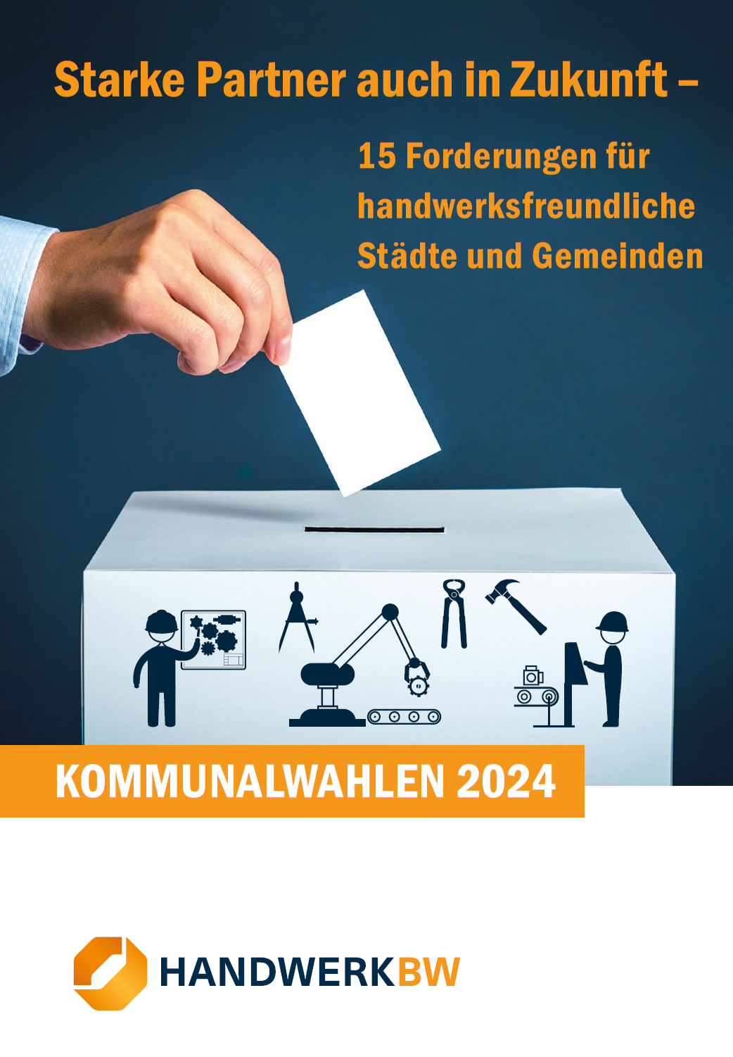 Im Vorfeld der Kommunalwahl in Baden-Württemberg am 9. Juni hat Handwerk BW einen Katalog mit 15 Forderungen herausgegeben, die das Handwerk in den Städten und Gemeinden des Landes stärken sollen. Diese reichen von Handwerker-Parkausweisen über eine Modernisierung der Schulen bis zur Bekämpfung von Schwarzarbeit. Einen Flyer mit den 15 Forderungen hat Handwerk BW auch online veröffentlicht,